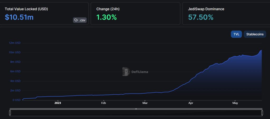 The major player responsible for more than 57% (over $6 million) of Starknet TVL dominance is JediSwap, a fully permissionless AMM that enables users to swap, earn, and build instantaneously on the decentralized, community-driven protocol.