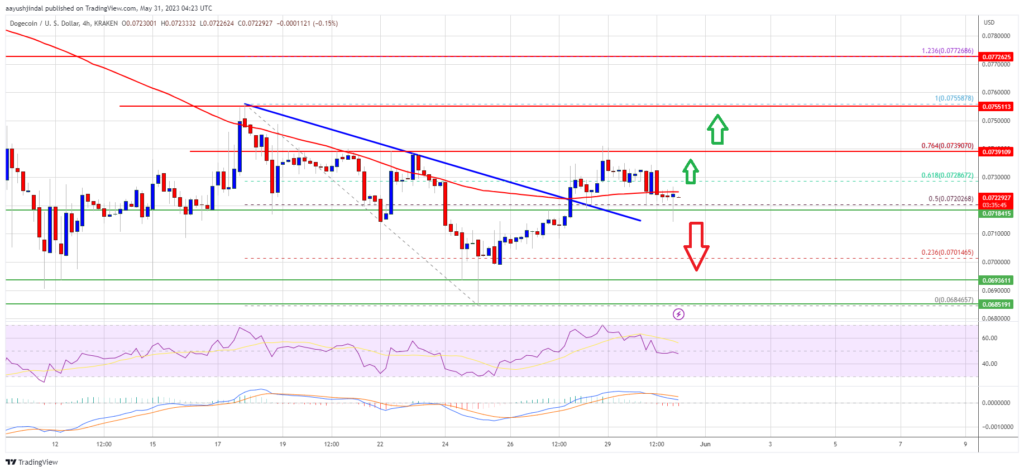 Doge is now trading below the $0.0725 zone and the 100 simple moving average (4 hours). It is holding the key $0.0718 support zone. On the upside, the price is facing resistance near the $0.0722 level. The first major resistance is near the $0.0740 level.