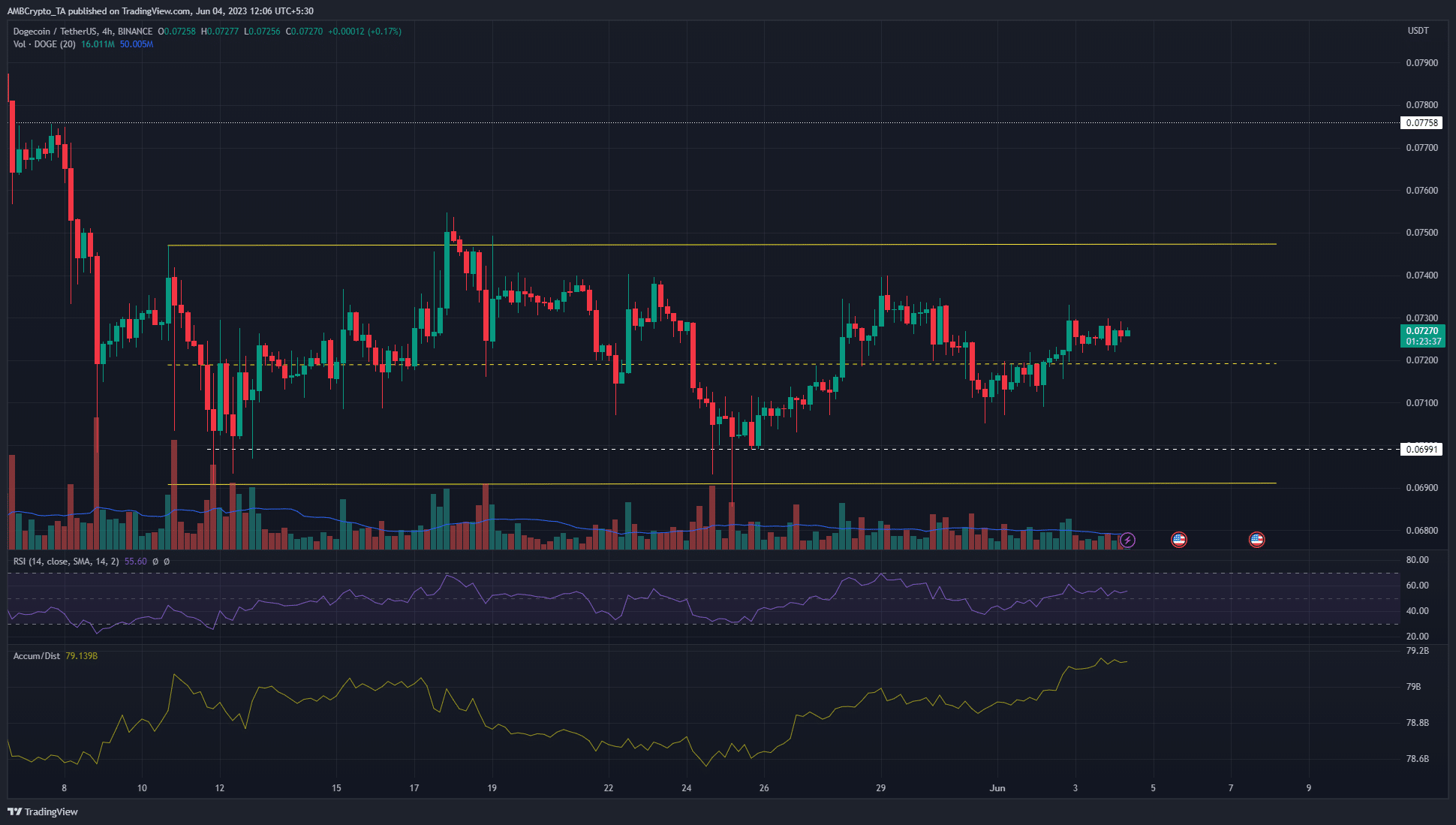 Dogecoin has traded within a range (yellow) from May. This range extended from $0.069 to $0.075. Additionally, there was short-term resistance at the $0.074 mark which the DOGE bulls have not overcome since 19 May.