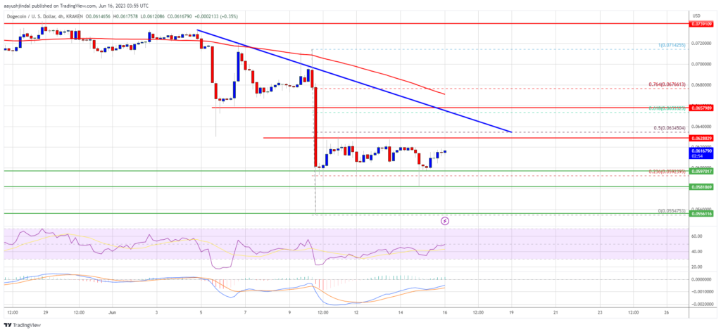 - There is a major bearish trend line forming with resistance near $0.0635 on the 4-hours chart of the DOGE/USD pair (data source from Kraken).