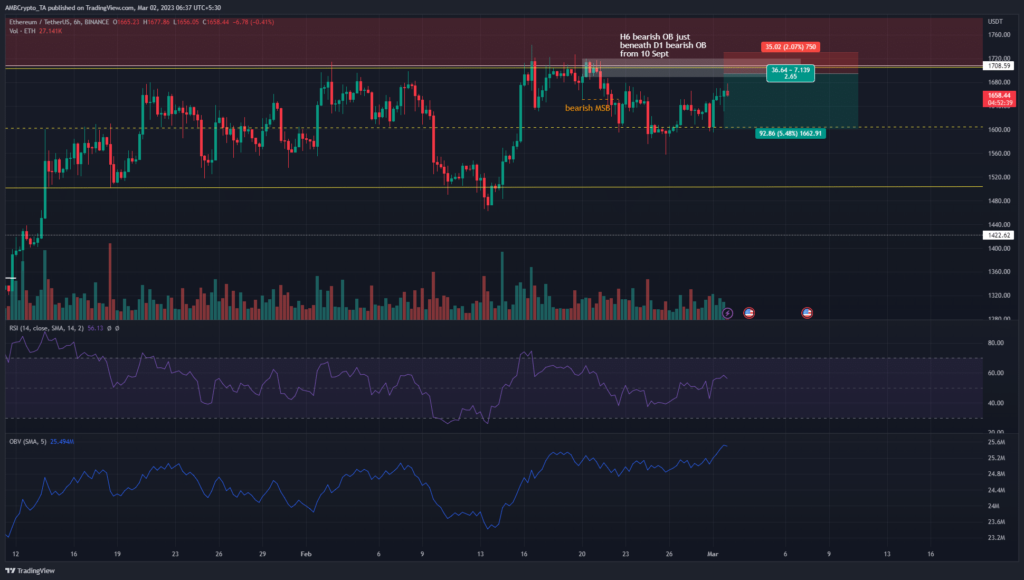 The shift in structure also showed another bearish order block, this time on the H6 timeframe. Highlighted in white, a retest of this region could offer a shorting opportunity for Ethereum traders. Moreover, there was a fair value gap that extended from $1687-$1695.