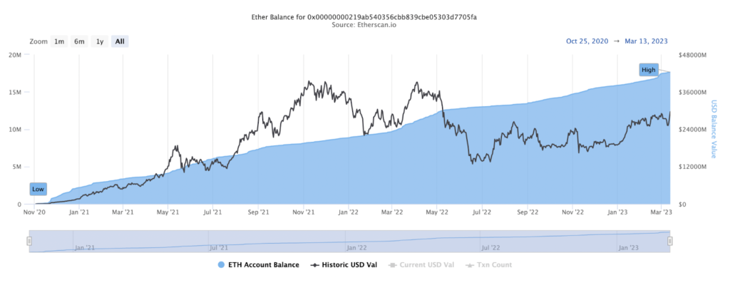 ETH has since rallied as much as 1,000%, reaching a high of $4,878 one year after the Beacon contract went live, before dropping 64% to under $1,800 today.