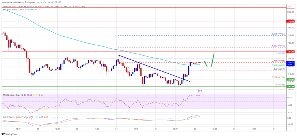 Ethereum’s price extended its decline below the $1,820 zone. However, ETH remained well-bid above the $1,800 level and recently started an upside correction, similar to Bitcoin from $27,000.