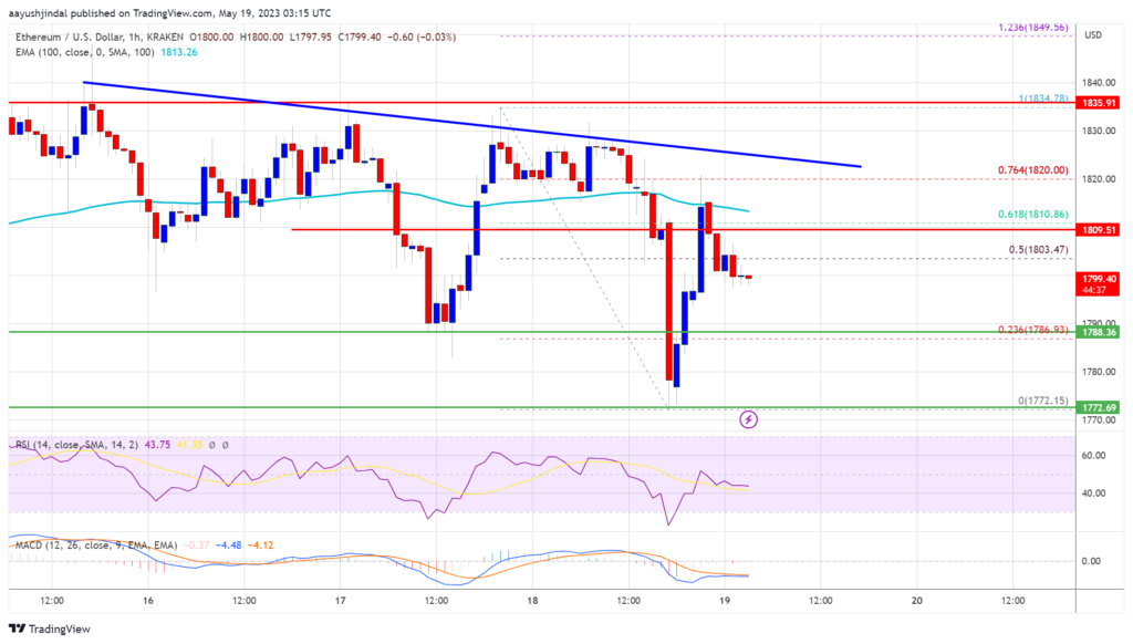 Ethereum’s price remained in a bearish zone below the $1,840 zone. ETH started a fresh decline below the $1,800 level and showed a few bearish signs, similar to Bitcoin.