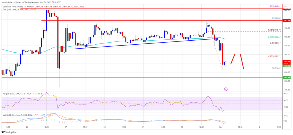 Ethereum price started a fresh decline from the $1,940 resistance against the US Dollar. ETH retested $1,825 and is showing a few bearish signs.
