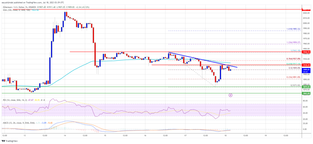 - There is a connecting bearish trend line forming with resistance near $1,910 on the hourly chart of ETH/USD (data feed via Kraken).