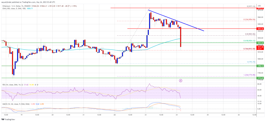 Ethereum’s price attempted a fresh increase above the $1,850 resistance zone. However, ETH bears remained active near the $1,880 level and the price started another decline, similar to Bitcoin.