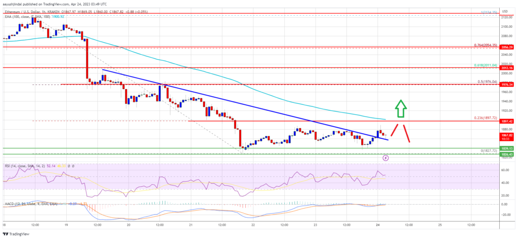 The bears even pushed the price below the $1,880 support. A low is formed near $1,827 and the price is now consolidating losses. Ether is now trading below $1,920 and the 100-hourly Simple Moving Average. Recently, there was a minor increase above $1,850. There was a break above a major bearish trend line with resistance near $1,860 on the hourly chart of ETH/USD.