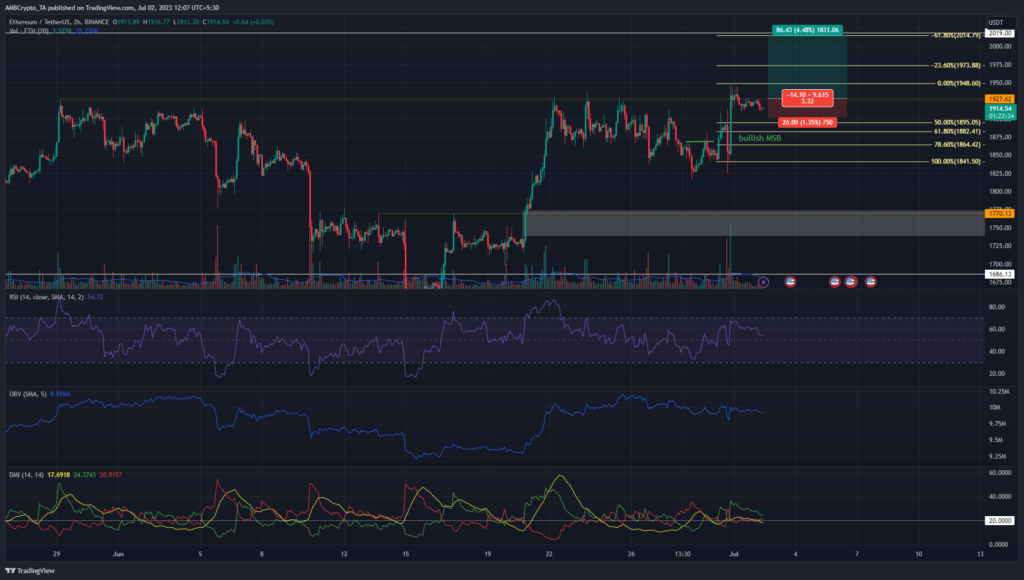 The 2-hour chart showed that Ethereum had a bullish market structure. The prices have ventured as high as $1948 before retreating, a region that was previously tested back in the first week of May. Therefore, it is a sign that bulls were dominant.