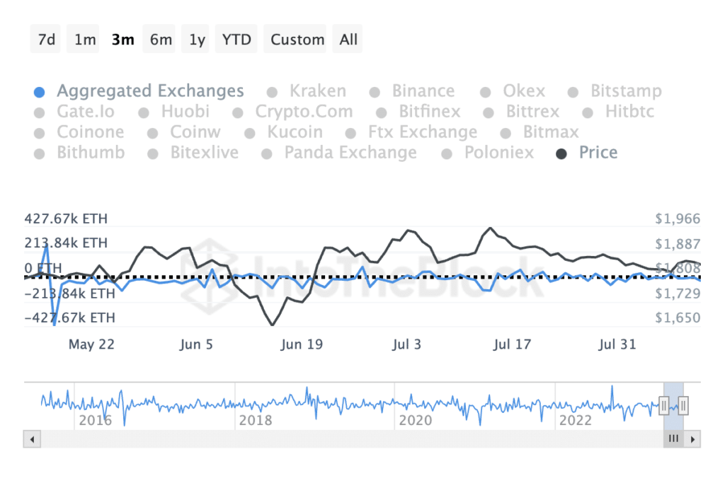 Despite the narrow price movement in the past few months, ETH’s exchange activity revealed fewer sell-offs. This means that the coin’s investors had largely refused to sell their holdings and held on to them instead. Per data from IntoTheBlock, ETH’s net flow has been predominantly negative in the last 90 days.