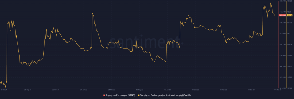 The Sandbox [SAND] investors are still figuring out where the token is headed as 20% of the total SAND supply was unlocked on 14 February. Additionally, the token supply to exchanges significantly increased just before the event. Around 560 million SANDs were pushed to the exchanges before the unlock, as seen by Supply on Exchanges on Santiment.Â