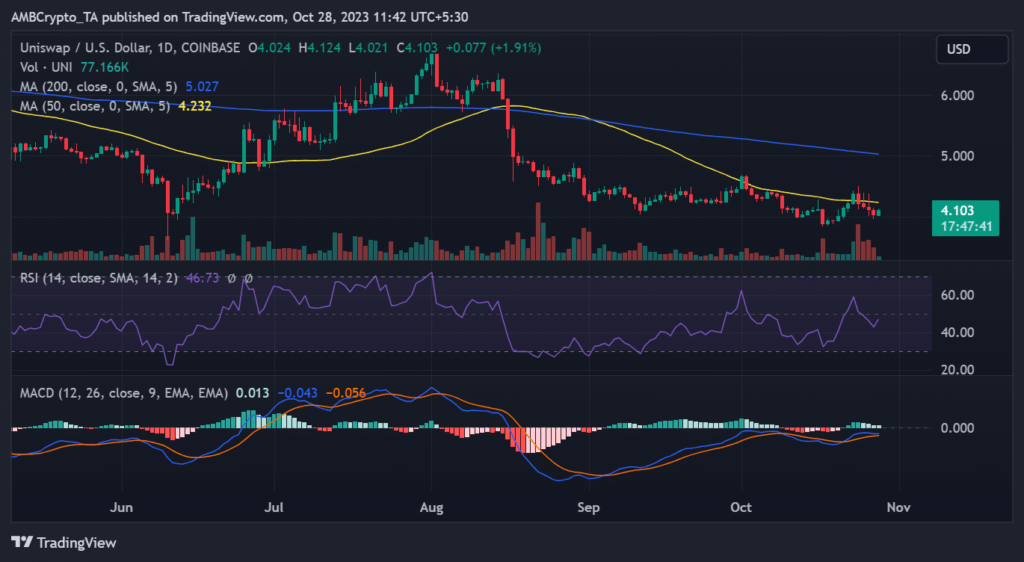 As of this writing, UNI appeared to be experiencing a modest recovery from its recent decline. It was trading at a price that had risen by just over 1%, reaching approximately $4.