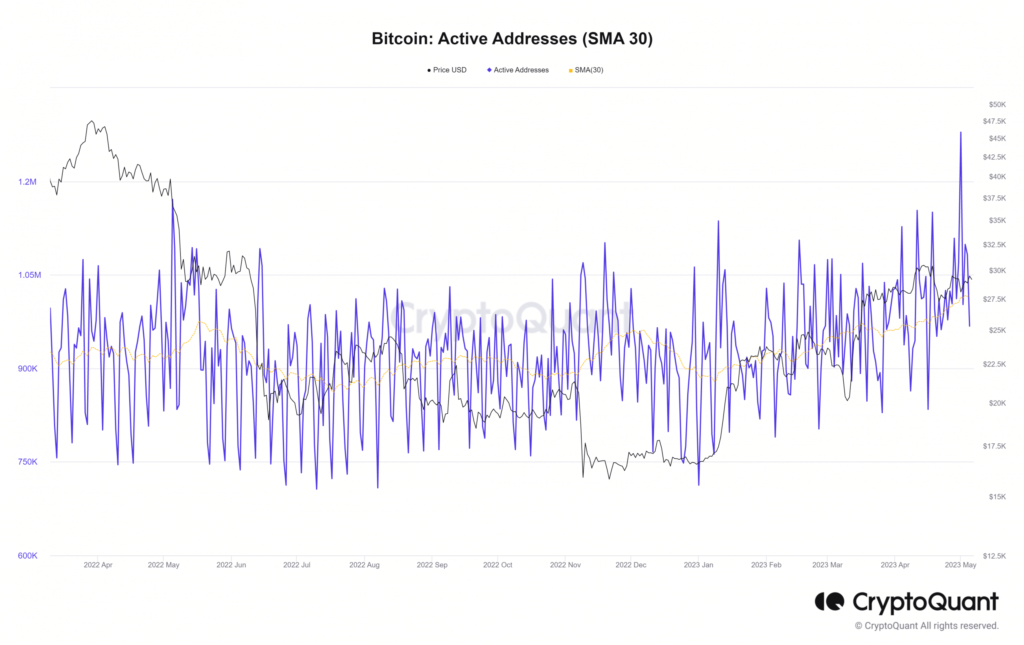 The disruption in the pattern of active addresses can be partially attributed to the enthusiasm surrounding the Ordinals craze.