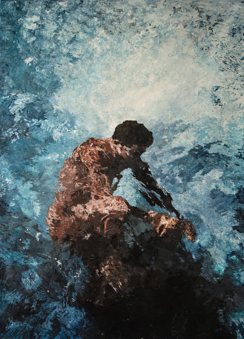 “My art is not focused on the human body in particular, regardless of whether it’s female or male,” Zhuk said of her work. “The image of a character in my works is only a human form, which any viewer can try on themselves in order to feel the atmosphere and emotions that I want to convey through the canvas. I depict naked bodies because this is how we come into this world, naked and in the water, which I also use in my works. Thus, I try to remove the entire material and everyday layer of our life, leaving nothing else but pure feelings.”