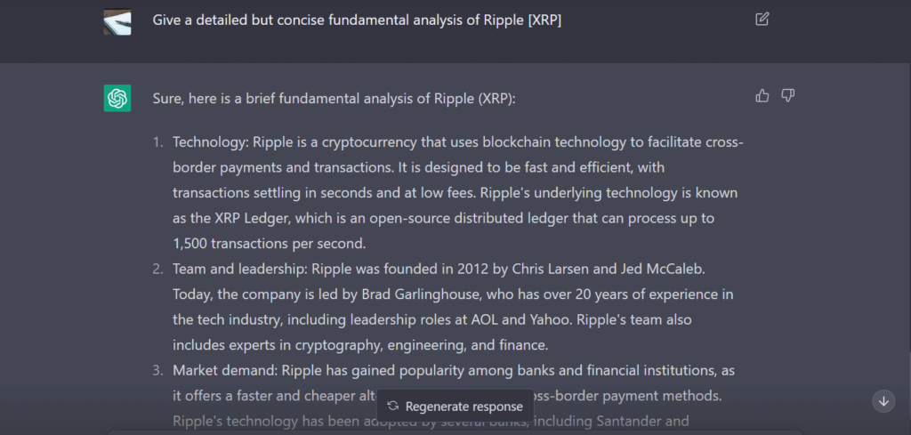 We asked ChatGPT to give us a fundamental analysis of XRP and it offered a detailed answer, as shown.