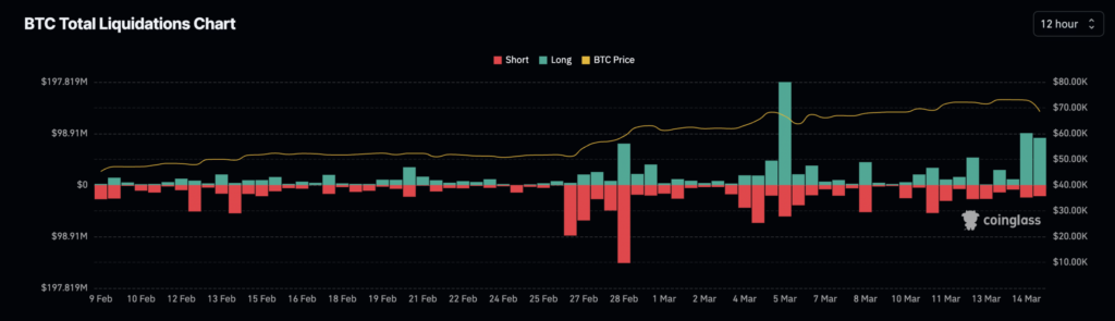 Leading coin Bitcoin [BTC] has seen its price decline by almost 10% in the past 24 hours. During Asian trading hours of 15th March, the price of the coin dropped to a low of $67,000, marking a 7% decline, before a brief rebound to $68,500.