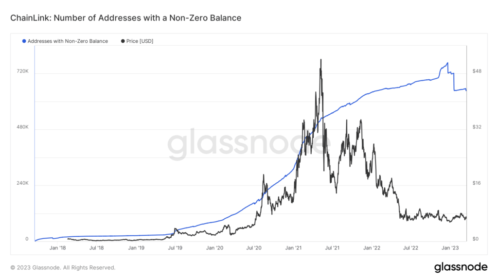 According to Glassnode, the non-zero LINK addresses have decreased to 665,850. As inferred from its name, the metric measures the number of addresses holding a positive number of cryptocurrencies.