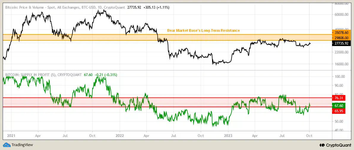 “At the same time, the long-term resistance of Bitcoin’s supply in profit (%) corresponds to the range of 65.95-76.31…”