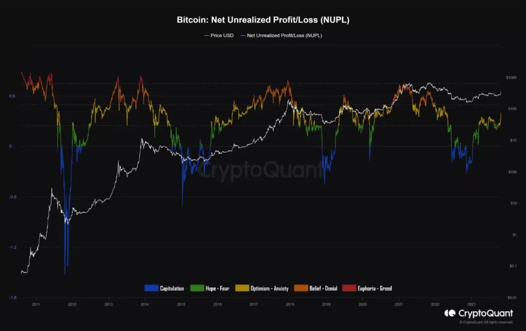 Bitcoin’s [BTC] Net Unrealized Profit and Loss (NUPL) has reached its Optimistic phase, indicating that the prevailing sentiment is more bullish, pseudonymous CryptoQuant analyst Gaah noted in a recent report.