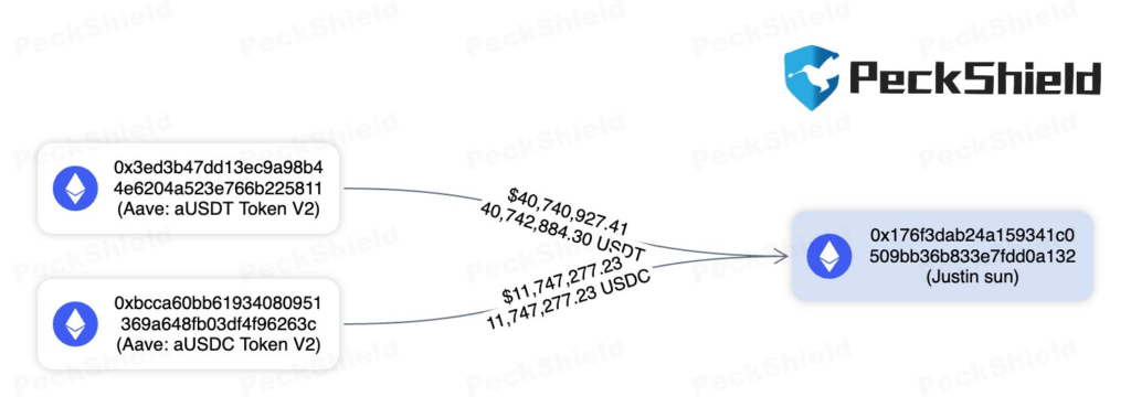 #PeckShieldAlert #JustinSun has withdrawn ~52.5M Stablecoins (~40.7M $USDT & ~11.7M $USDC) from #AAVE https://t.co/gvvwErLIpthttps://t.co/cjMiaTYflX pic.twitter.com/tzY0uwJPqI