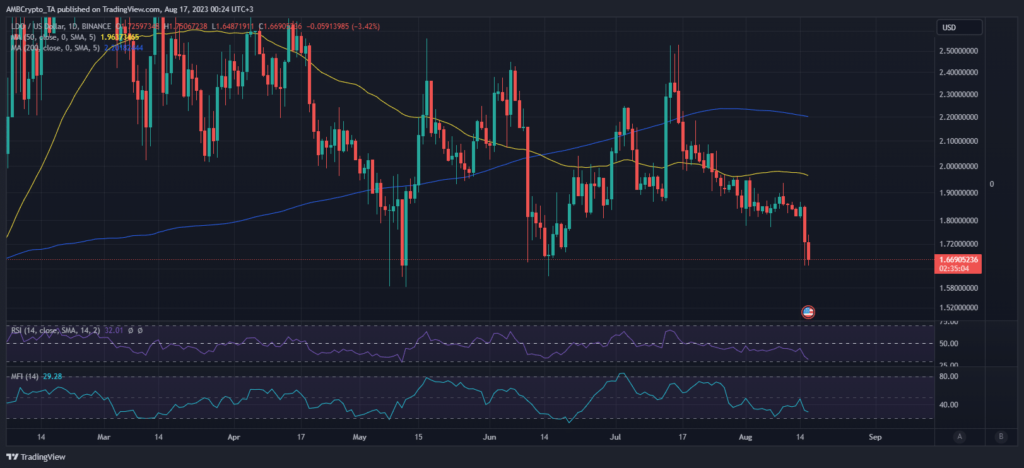 Lido Finance’s native token LDO sustained a strong bearish performance since mid-July. At press time, the token stood at $1.66. This meant that the altcoin was down by over 30%. However, there is one key observation that may offer some insights into what to expect.