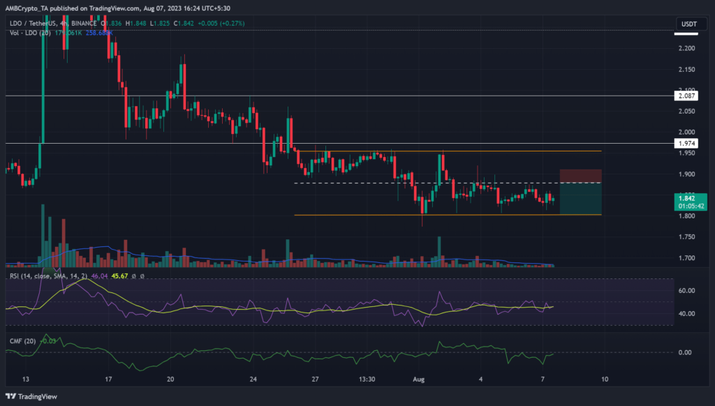 After losing hold of the $2 price level, Lido’s [LDO] attempts to reclaim the psychological has been constrained at $1.95. Since late July, the altcoin has faced several price rejections at $1.95, but entered a narrow price range between $1.95 – $1.80. The elevated market uncertainty constricted price action on the lower range; short-sellers can consider this level for potential gains.
