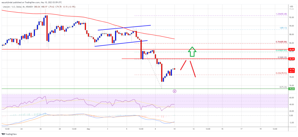 Besides, there was a break below a key rising channel with support near $86 on the 4-hour chart of the LTC/USD pair. The pair traded below the $80 support level. A low is formed near $75.26 and the price is now attempting a recovery wave.