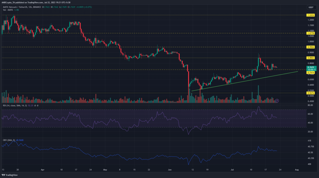 The 12-hour price chart revealed a continuation of MATIC’s uptrend, despite the recent pullback encountered by bulls. The rally from the $0.5274 support level made a series of higher lows before experiencing significant resistance at the $0.8503 level.