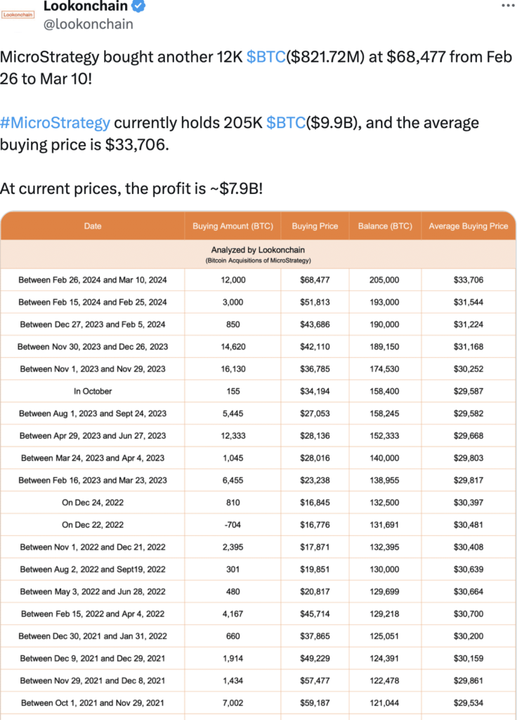 According to data from Lookonchain, from the 26th of February to the 10th of March, Michael Saylor’s company, MicroStrategy acquired 12K BTC, totaling $821.72 million, at an average price of $68,477.