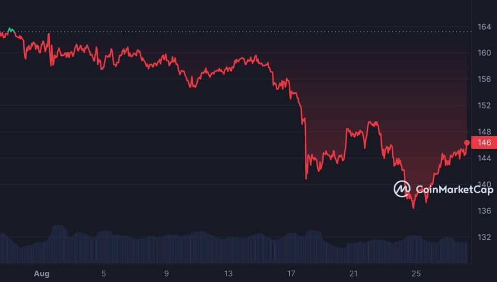 At press time, the altcoin exchanged hands at $146.19, according to data from CoinMarketCap. In the last month, XMR’s value has decreased by 10%.