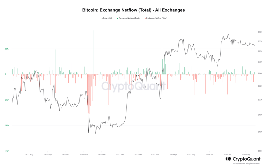 An examination of the movement of Bitcoin on various exchanges revealed a recent trend of increased BTC leaving these platforms. Based on data from the exchange netflow chart provided by CryptoQuant, nearly 8,000 BTC were withdrawn from these exchanges between 14 and 15 August.