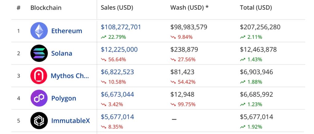 This week, Solana-based NFT sales made up $12,225,000 of the total sales, however, this marks a 56.64% decrease from the previous week. Ethereum and Solana sales still lead the pack, followed by Mythos, Polygon, and Immutable X. Ethereum sales have seen a significant increase, and sales from Ronin have also jumped by 20%, while Arbitrum has experienced a 14% increase. Moreover, Panini blockchain digital collectible sales have taken a hit, dropping by 31.23% this week.