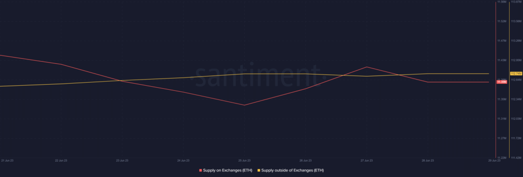 Santiment’s chart revealed that Ethereum’s supply on exchanges and supply outside of exchanges were also close to each other, which looked bearish as there was a possibility of the former flipping the latter in the coming days.
