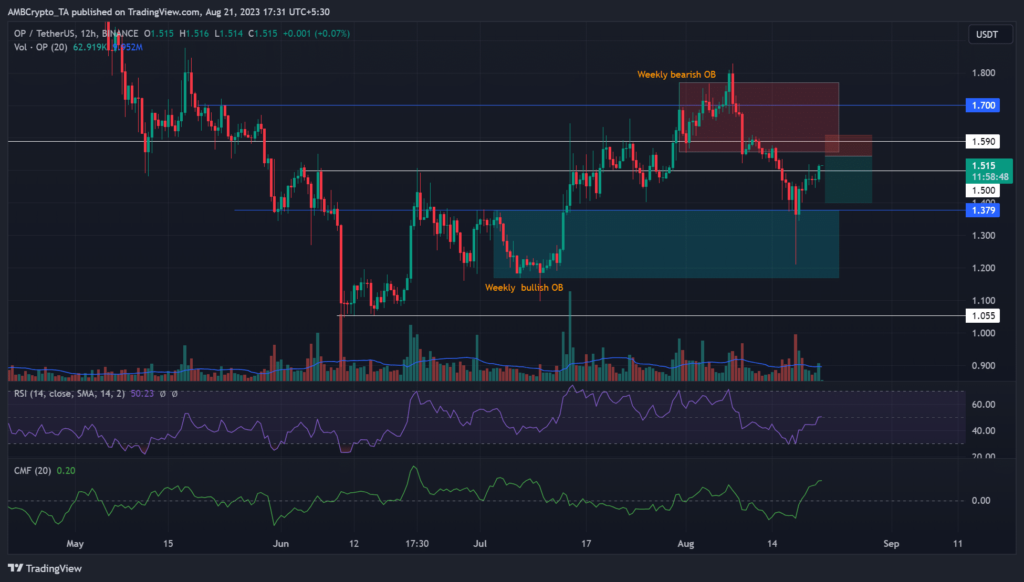 The Chaikin Money Flow (CMF) was above zero, indicating massive capital inflows into OP’s market. But the Relative Strength Index (RSI) hadn’t decisively crossed above the 50-mark. An RSI rejection at the median level could signal sellers’ re-entry.