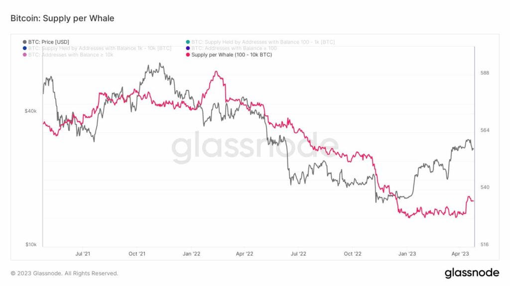 Whales were also observed to be showing interest in BTC over the last few weeks. During the weekend, there was a continuous accumulation of Bitcoin by the whales, with each whale’s supply exceeding 530 BTC for the first time since the FTX collapse.