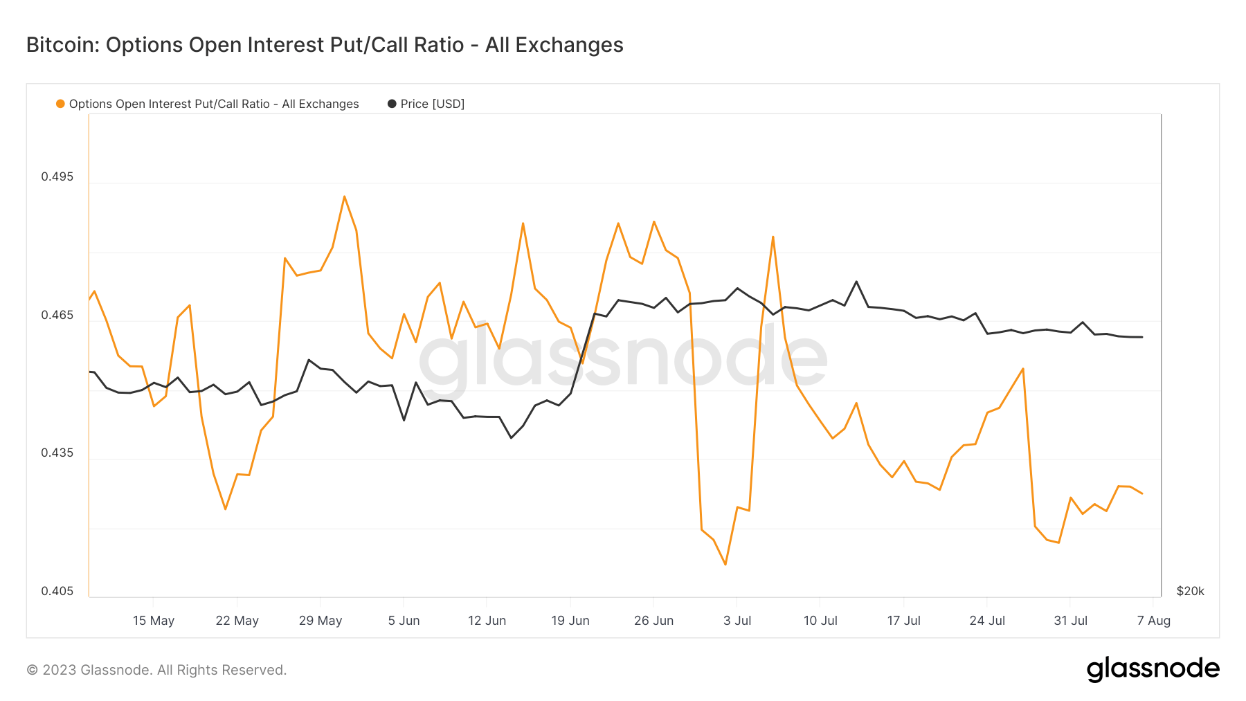 The Bitcoin Options Open Interest Put/Call Ratio is a metric that measures the total number of open put options to call options in the market. This ratio dropped sharply on July 27, reaching this year’s lows.