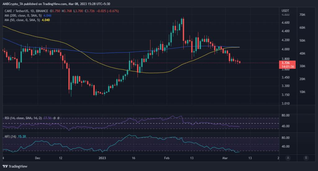 CAKE’s value has been declining since 9 February. In fact, it has so far tanked by 21% to its $3.72 press time price. As a result, it has given up roughly half of the gains it achieved since the start of 2023.