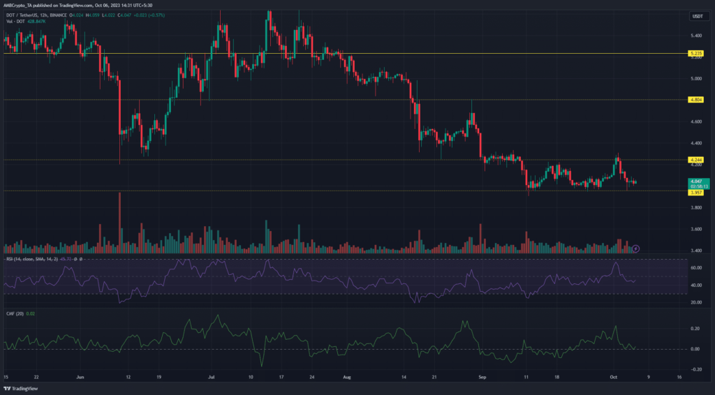 - Price rejection at $4.3 resistance kept DOT in a range formation.