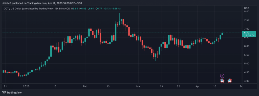 At press time, DOT was trading at $6.76 with a market cap of $7.9 billion. Its 24-hour daily trading volume was $243 million, making it the 12th largest cryptocurrency in the world. The last 7 days saw DOT appreciate by 8% on the charts.