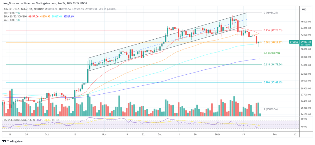 BTC price hovers below $40,000, 1-day chart | Source: BTCUSD on TradingView.com