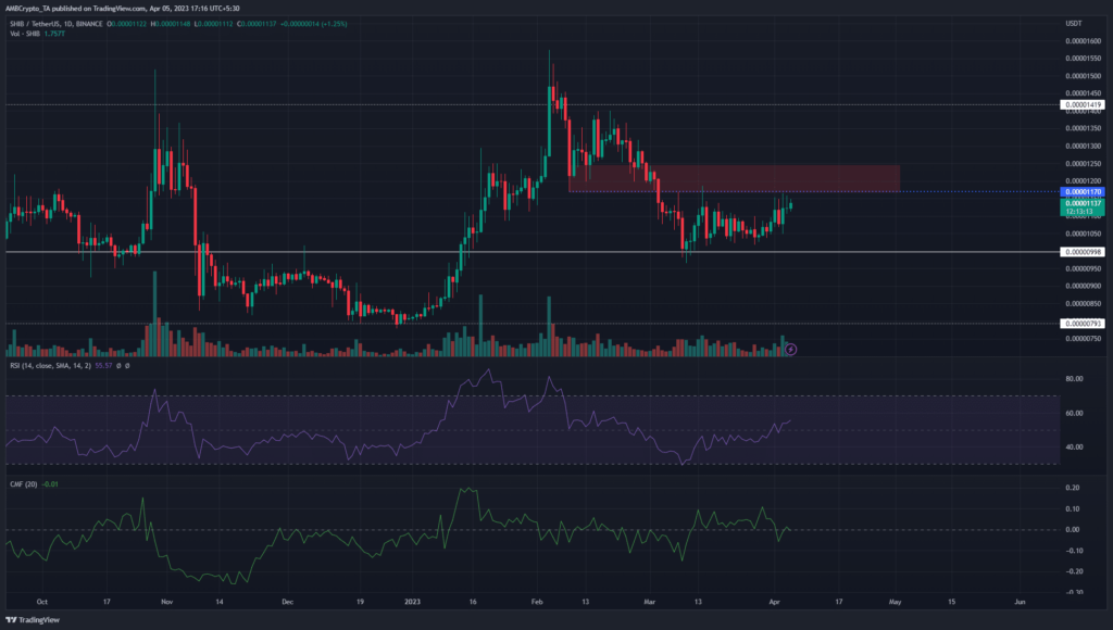 During the pullback, SHIB fell beneath the $0.0000117 level, which was a recent higher low during the early 2023’s rally. In doing so, the market structure of Shiba Inu was shifted to bearish. Moreover, the $0.0000117-$0.0000125 area (highlighted in red) was likely to serve as a significant resistance in the weeks to come.