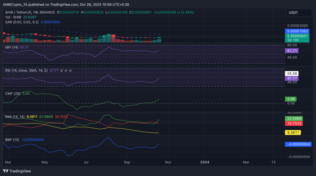 For example, SHIB’s Money Flow Index (MFI) was 61.70. Likewise, its Chaikin Money Flow (CMF) returned a positive value of 0.06 as of this writing.