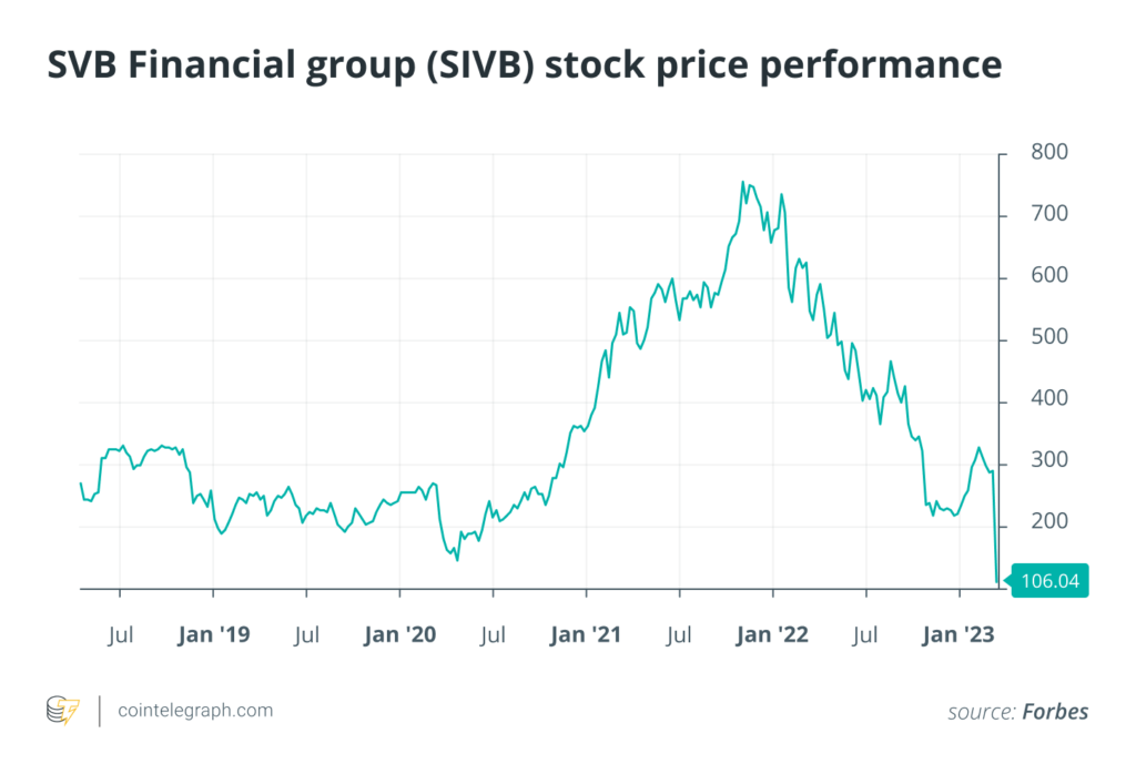 Data from Forbes highlights SVB Financial’s stock price performance over the past five years. SIVB hovered between highs of around $325 and $136 between 2018 and the end of 2020. It then hit highs of approximately $759 at the tail end of 2021 before a slow and steady decline alongside the wider cryptocurrency and conventional markets.