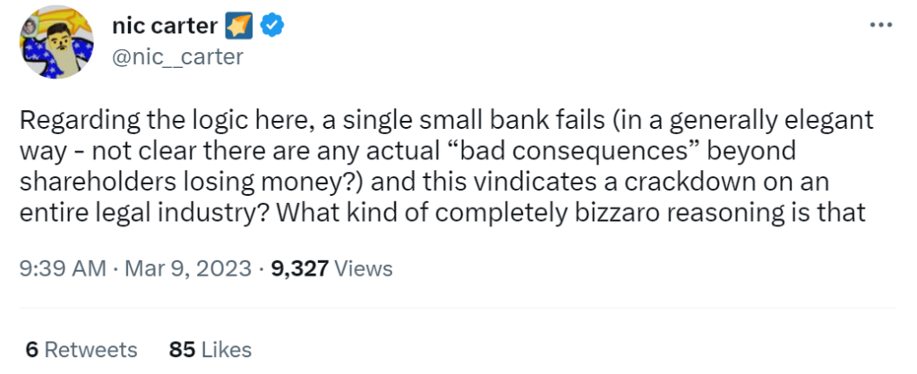 Meanwhile, Nic Carter, co-founder of venture firm Castle Island and crypto intelligence firm Coin Metrics, suggested that it was the government that “hastened the collapse” of Silvergate by launching investigations and legal attacks on it.
