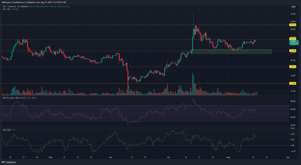 The double bullish candles on the 12-hour timeframe over the past 24 hours took Solana to the $25.3 resistance. Despite the slight pullback, the structure remained bullish with price trending higher after the recovery at the $22 bullish order block.