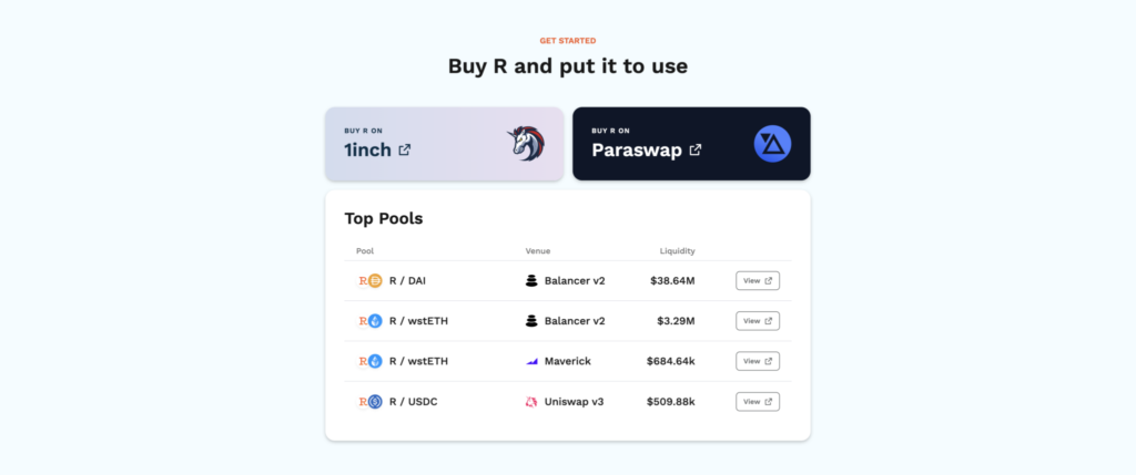 The Redemption feature allows users to exchange R tokens for wstETH (wrapped stETH) at a value equivalent to 1 USD. Notably, when R tokens are redeemed, they are subsequently burned, effectively reducing the circulating supply and contributing to an increase in the price of R. This ensures that even if the price of R falls below the $1 mark, users have the opportunity to redeem their tokens and help stabilize the value.