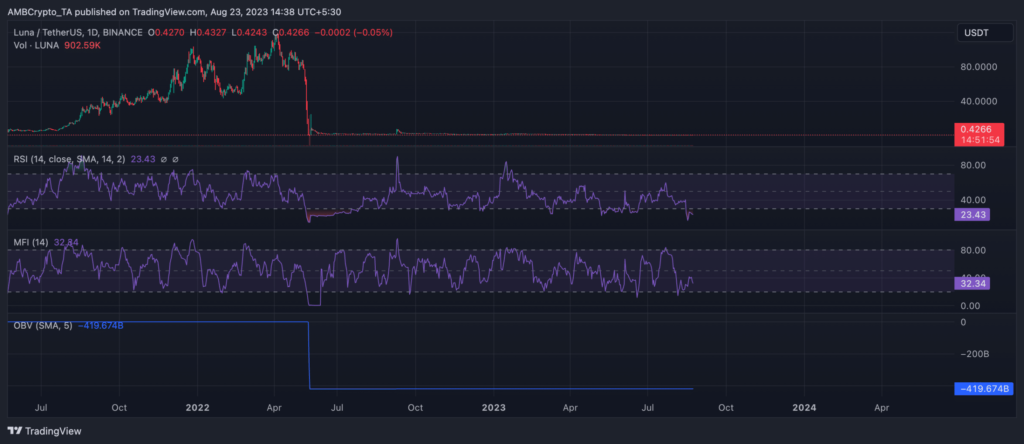 LUNA’s On-Balance Volume (OBV) fell sharply when UST collapsed over a year ago, and has since remained flat. With a negative OBV value of -419.672 billion at press time, selling pressure significantly outweighed buying pressure.