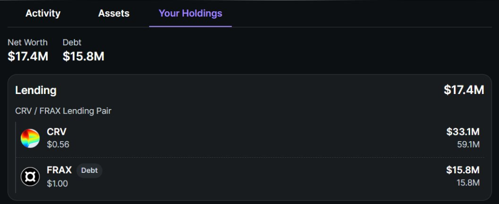 The report revealed that Egorov currently holds a staggering 59 million CRV collaterals and 15.8 million FRAX debt positions on the platform, overshadowing his holdings on Aave. While the position might seem smaller in size, the intricate dynamics of Fraxlend’s time-weighted variable rate pose substantial risks to the CRV ecosystem.