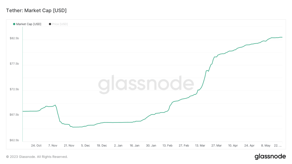 Since the March banking crisis, USDT has added an astounding $11 billion to its market valuation, bringing the total to $82 billion at the time of publication, as per Glassnode.