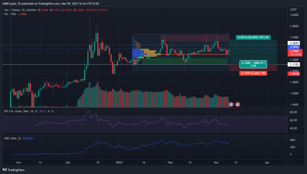 Since the end of January, The Open Network’s TON, has consolidated in the $2.2 – $2.6 range. At press time, its price action had retested a key value area that could induce the market to a recovery. However, a pullback retest on this key value area could offer new buying opportunities and extra gains if overall market sentiment improves.